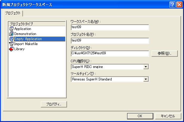プロジェクトタイプは Empty Applicationとし、適当なワークスペース名をつけて、CPU種別をSuperH RISC engine とします。