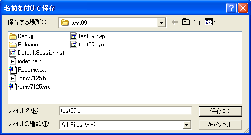 次に、ユーザーのプログラムを追加します。[ファイル]->[新規作成]で、ユーザープログラムを作成し、[ファイル]->[名前を付けて保存]でソースコードとして保存します。この例では、test09.c というファイル名でCのプログラムを保存します。