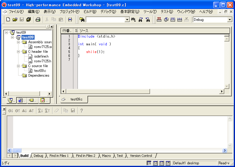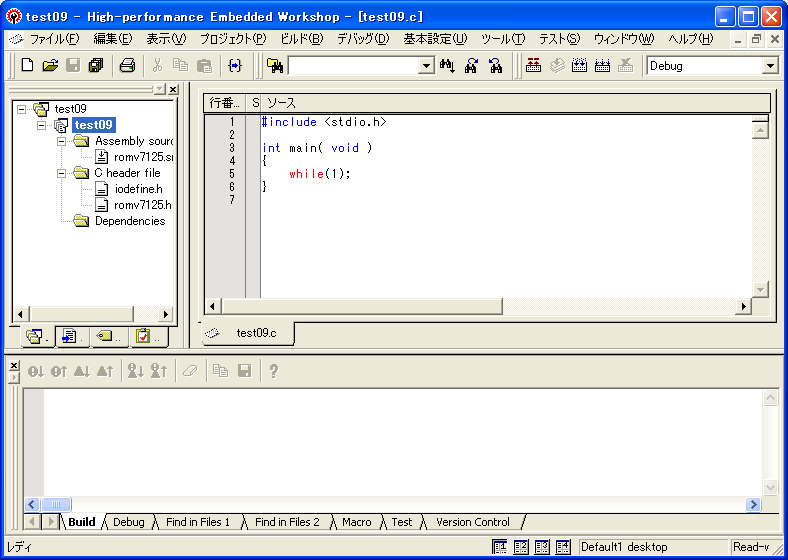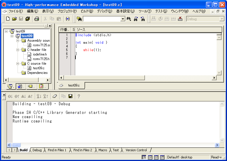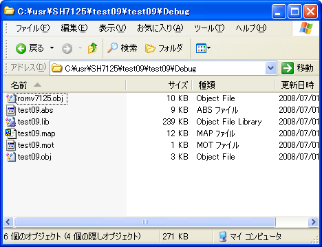 正常に終了すると、プロジェクトのフォルダにある『Debug』『Release』に、プロジェクト名.LIB、プロジェクト名.ABS、プロジェクト名.MAP、プロジェクト名.MOT ファイルが生成されます。ADEBUGSH.EXEデバッガで使用するのは、この中のMAPファイルとMOTファイルです。