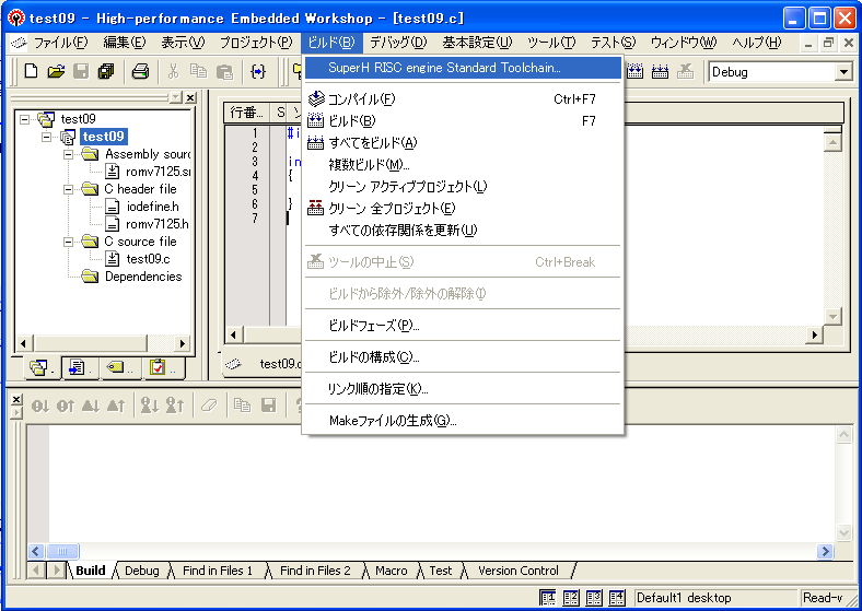 まず、[ビルド]->[SuperH RISC engine Standard Toolchain...]を選択します。