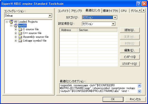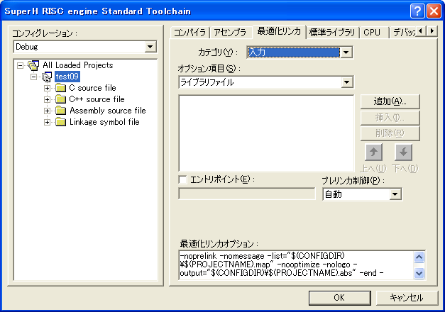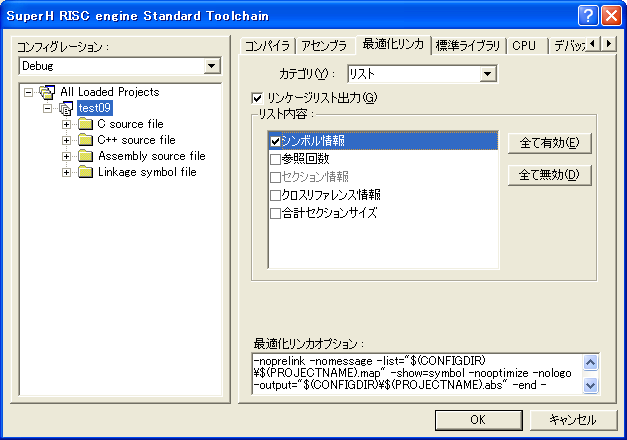 コンパイラ、アセンブラ、リンカなどのツールのオプション設定画面になります。左のペインで、プロジェクト『test09』を選び、『最適化リンカ』タブを選択します。