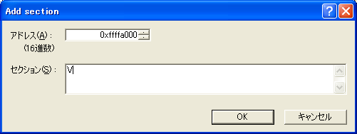 セクション名 配置アドレス 内容 V 0xFFFFA000 仮想ベクタテーブル。デバッガが実ベクタテーブルをフックし、この仮想ベクタテーブルに割り込みハンドラが登録されていいればそれを呼び出し、なにも登録されていなければデバッガに制御を移す。 R 0xFFFFA400 初期化付き変数領域のRAM上へのマップ。ROM上には『D』というセクションで配置される。 INI 0x00002000 ユーザープログラムの初期化コード。①初期値付き変数領域の初期化、②初期値無し変数領域のゼロクリア、③main()関数の呼び出しを行う。最初に実行されるのは、ラベル『START:』がついた行で、0x2000に配置する。