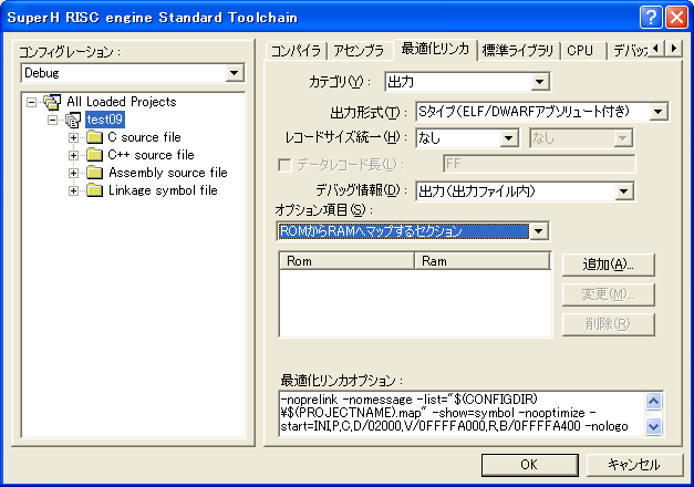 『最適化リンカ』タブの『カテゴリ:出力』を選び、オプション項目の『ROMからRAMへマップするセクション』を選びます。