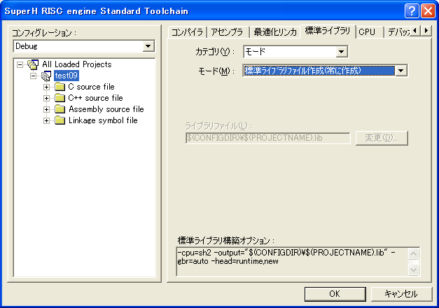 最後に、ライブラリを生成するように設定します。『標準ライブラリ』タブを選び、『モード:標準ライブラリファイル作成』を選びます。これを設定しないとほとんどの場合ビルドの最後にリンクエラーがでます。