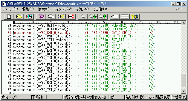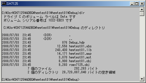 ここでは、『ユーザープログラムの作成』で作成したプログラムを、PC側デバッガ:ADEBUGSH.EXE、マイコンボード側デバッガ:ADBGSH7125.MOTを使って、ダウンロード、デバッグを行うシーケンスを説明します。あらかじめ、PATHの通ったディレクトリに、ADEBUGSH.EXEを入れておいて下さい。