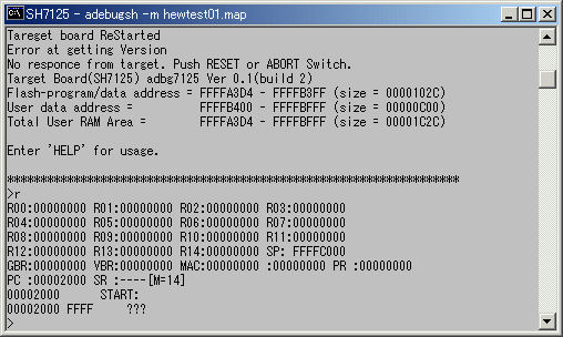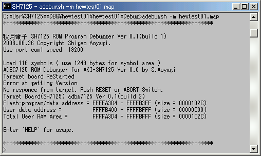 と打ち込むと、ADEBUGSH.EXEのオープニングメッセージの後、ユーザーRAMのアドレス、サイズなどをマイコンボードのADBGSH7125から取得して、コマンド待ちになります。下の図では、Total User RAM Areaと表示されているのがユーザーが使用可能なRAMサイズになります。