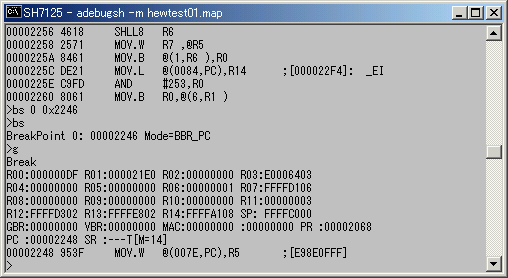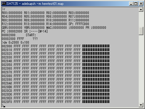 まず、リセット直後のレジスタの状態を見てみます。ADBGSH7125デバッガは、リセット直後には各レジスタの内容を初期化します。PCは0x2000に、R15(SP)は0xFFFFC000、それ以外のレジスタは0に設定します。
