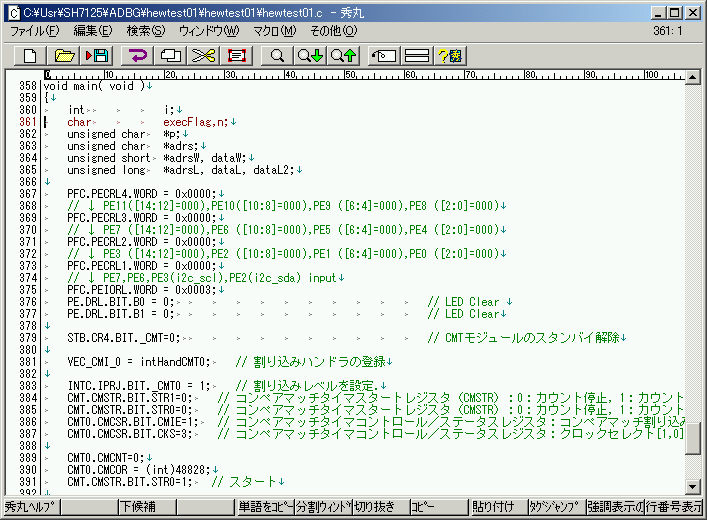 サンプルで公開している、『hewtest01』というテストプログラムを参考にします。このプログラムは、タイマー割り込み CMI_0を使って1秒ごとに割り込みを掛け、ベースボード上のLED(赤と緑)を交互に点灯させます。それと同時に、SCI1(デバッグ用のシリアルポート)を通してキー入力し、押されたキーをエコーバックします。押されたキーが『Enter』の場合は、改行すると同時に、起動時からの経過時間を16進で表示します。