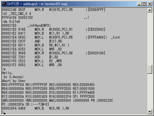 main() 関数で表示しているメッセージが画面に表示されました。このデバッガは、ユーザープログラムの実行中はターミナルモードになり、マイコンボードから送られてくる文字列をそのまま画面に表示します。